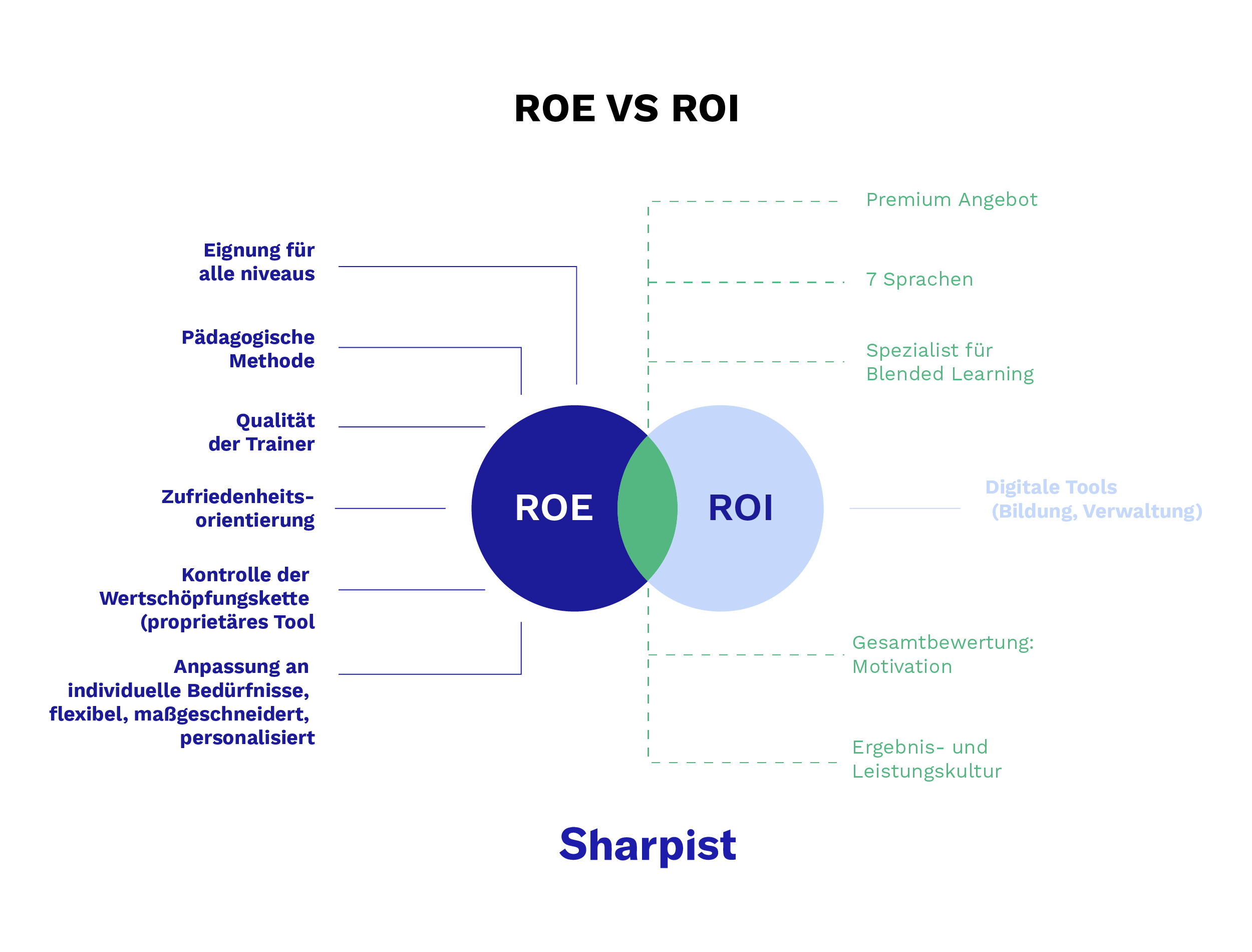 Bei Sharpist unterstützen wir Unternehmen durch einen ganzheitlicheren Ansatz bei der Bewertung von Coaching. Da wir erkannt haben, dass weder quantitative noch qualitative Kennzahlen allein ausreichen, um unternehmensweite Fortschritte zu messen, ziehen wir es vor, den Return on Expectations (oder ROE) zu betrachten. Auf diese Weise stellen wir sicher, dass unsere Coaching-Ziele klar definiert sind, die Erwartungen von Coach und Coachees übereinstimmen und die wichtigsten organisatorischen Ziele des Coachings erreicht werden.
