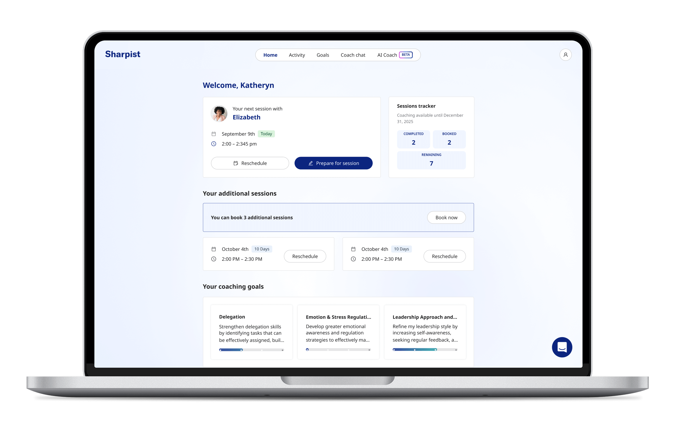 Unser fortschrittliches L&D-Dashboard bietet der Personalabteilung klare, umsetzbare Einblicke in den Fortschritt aller Teilnehmer. Die Ziele jedes Lernenden werden individuell analysiert und über die App Sharpist verfolgt, um die Übereinstimmung mit den Unternehmenszielen sicherzustellen. Da 100 % der Coaching-Sitzungen über unsere Plattform abgewickelt werden, liefern wir umfassende Berichte über das Engagement und die Ergebnisse.